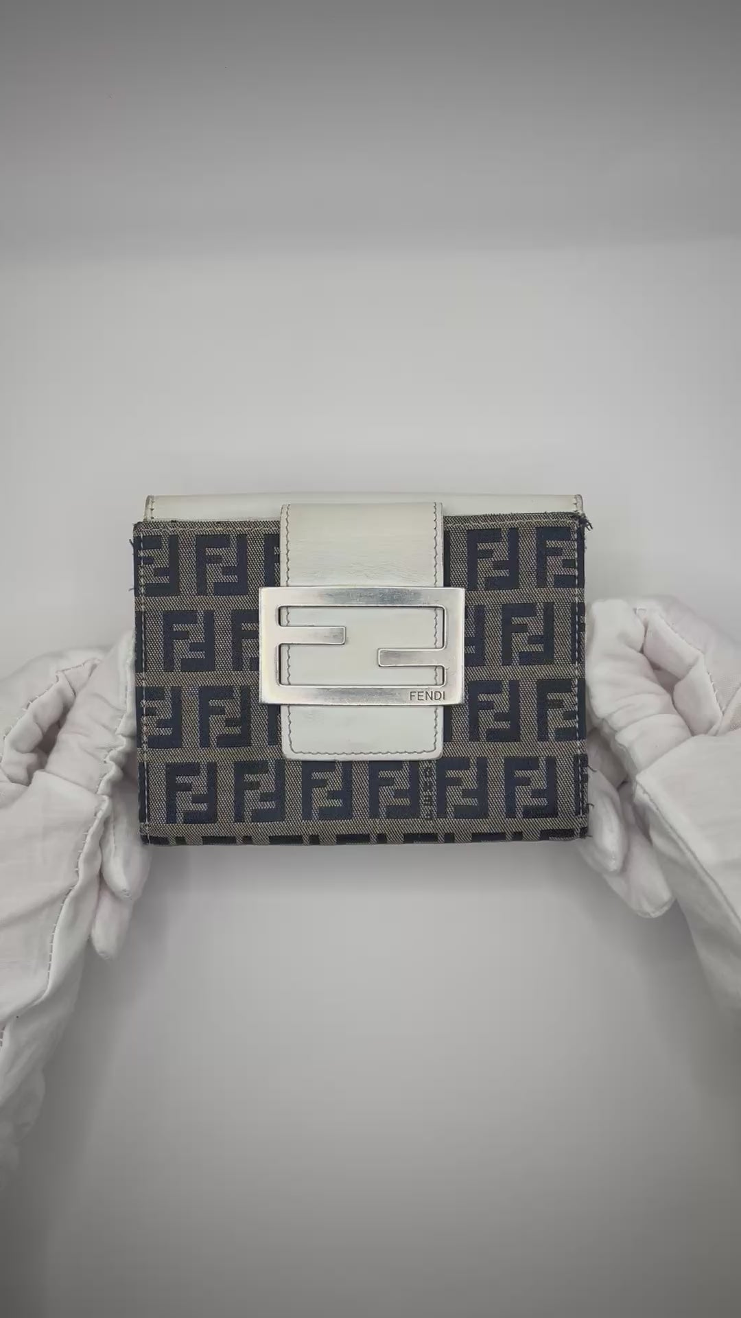 Classic and collectible Fendi Zucca monogram wallet featuring white leather trim and the iconic oversized “FF” metal buckle closure. Compact yet functional, with card slots, bill compartment, and snap closure. Made in Italy — embossed serial code 2411-8M0038-023 inside.